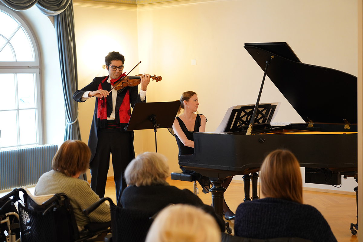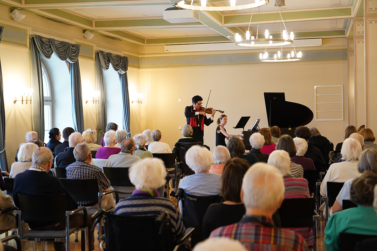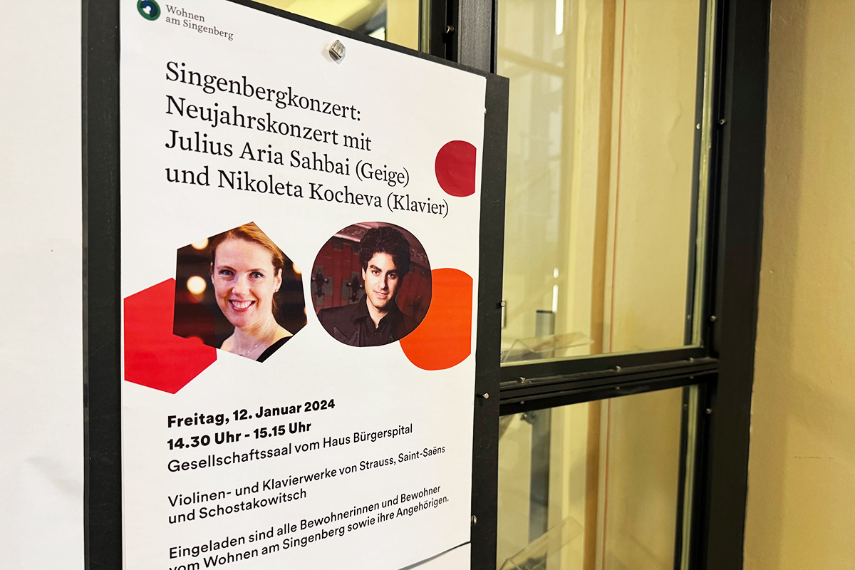 Die Bewohnerinnen und Bewohner vom Wohnen am Singenberg haben das neue Jahr zu musikalischen Klängen begrüsst. Der Geigen-Virtuose Julius Aria Sahbai und die Pianistin Nikoleta Kocheva haben das Publikum mit Werken von Strauss, Saint-Saëns und Schostakowitsch begeistert. Die beschwingten Walzerklänge haben den Gesellschaftsaal des Hauses Bürgerspital für eine Stunde in ein Konzerthaus verwandelt.