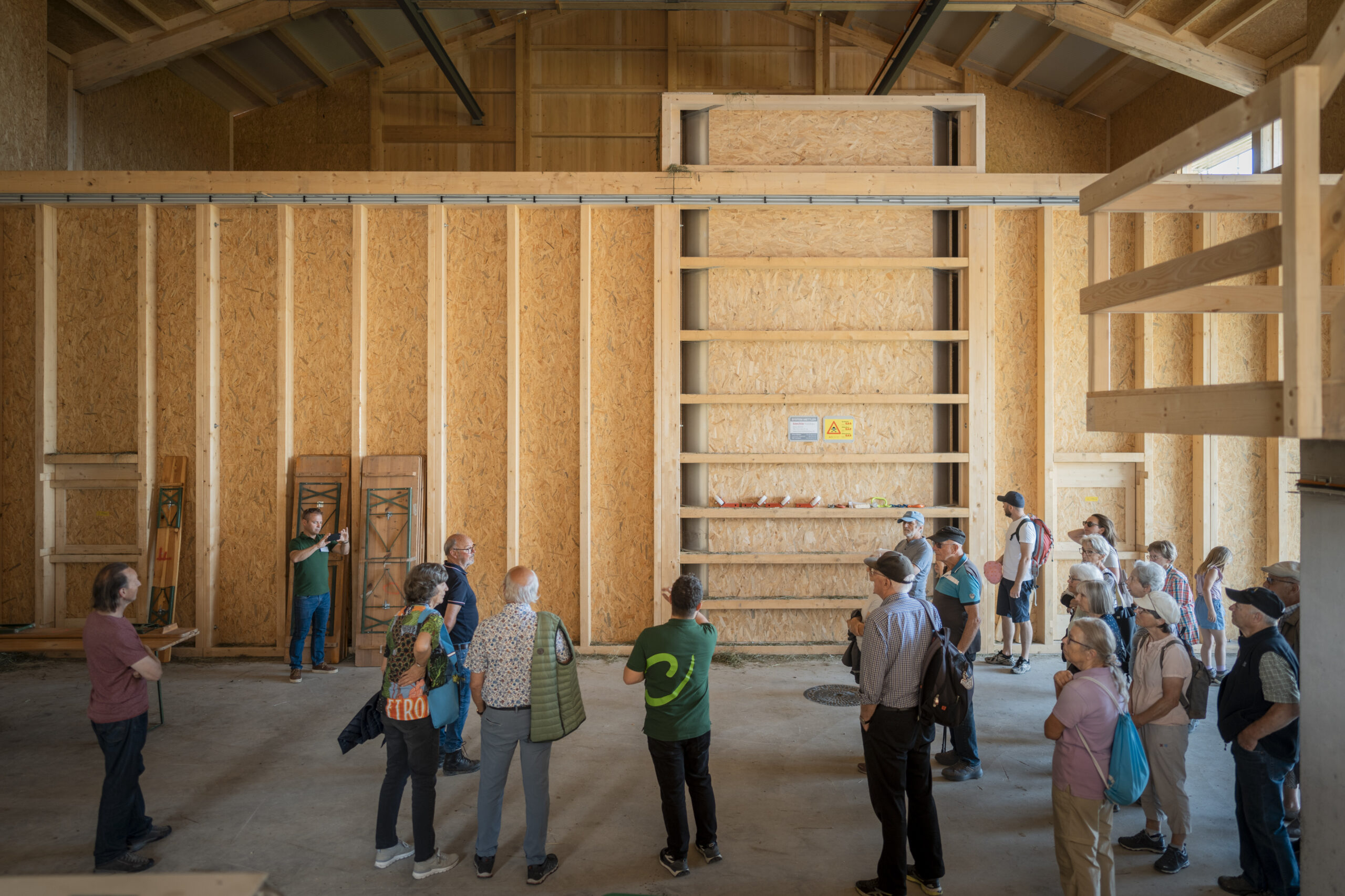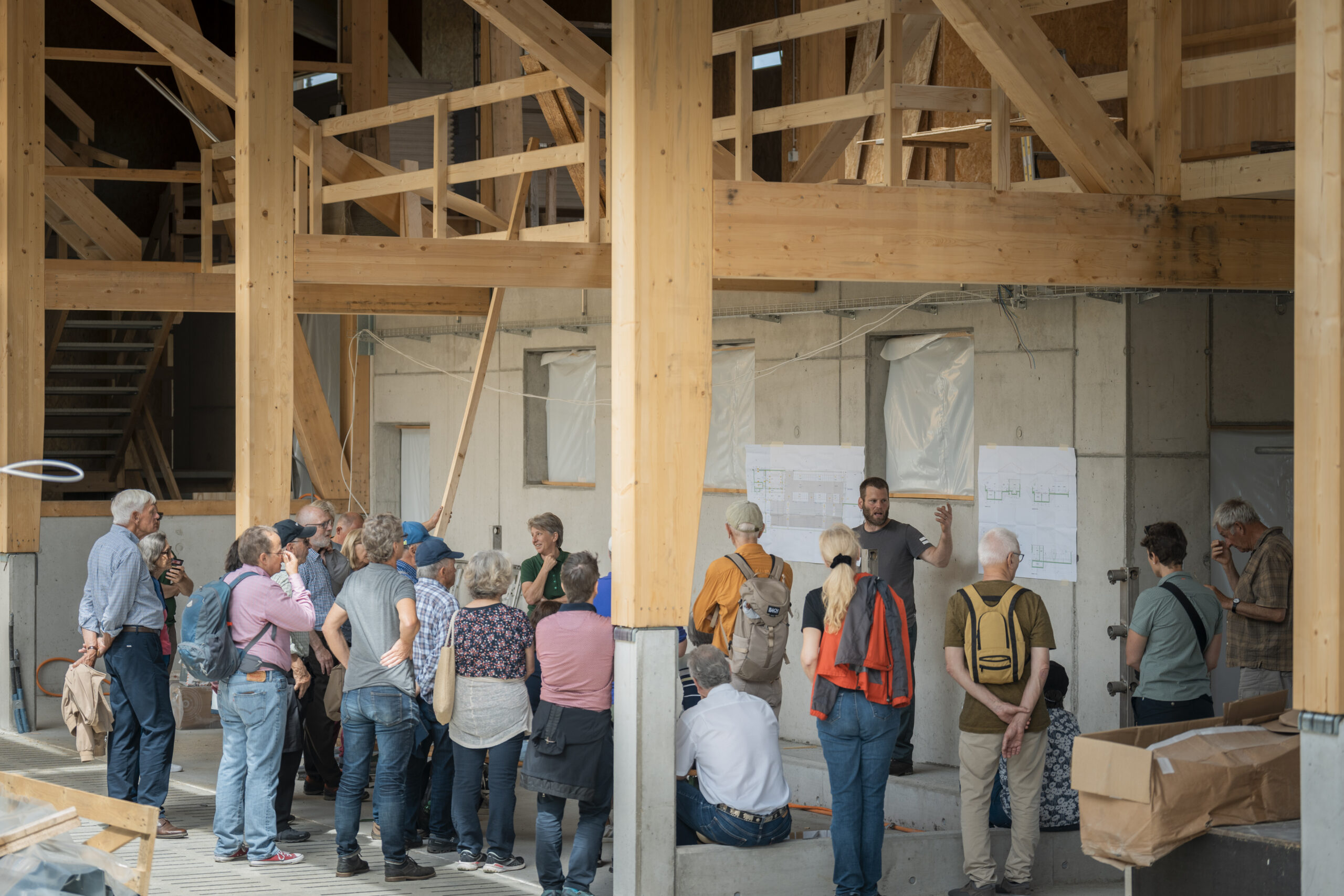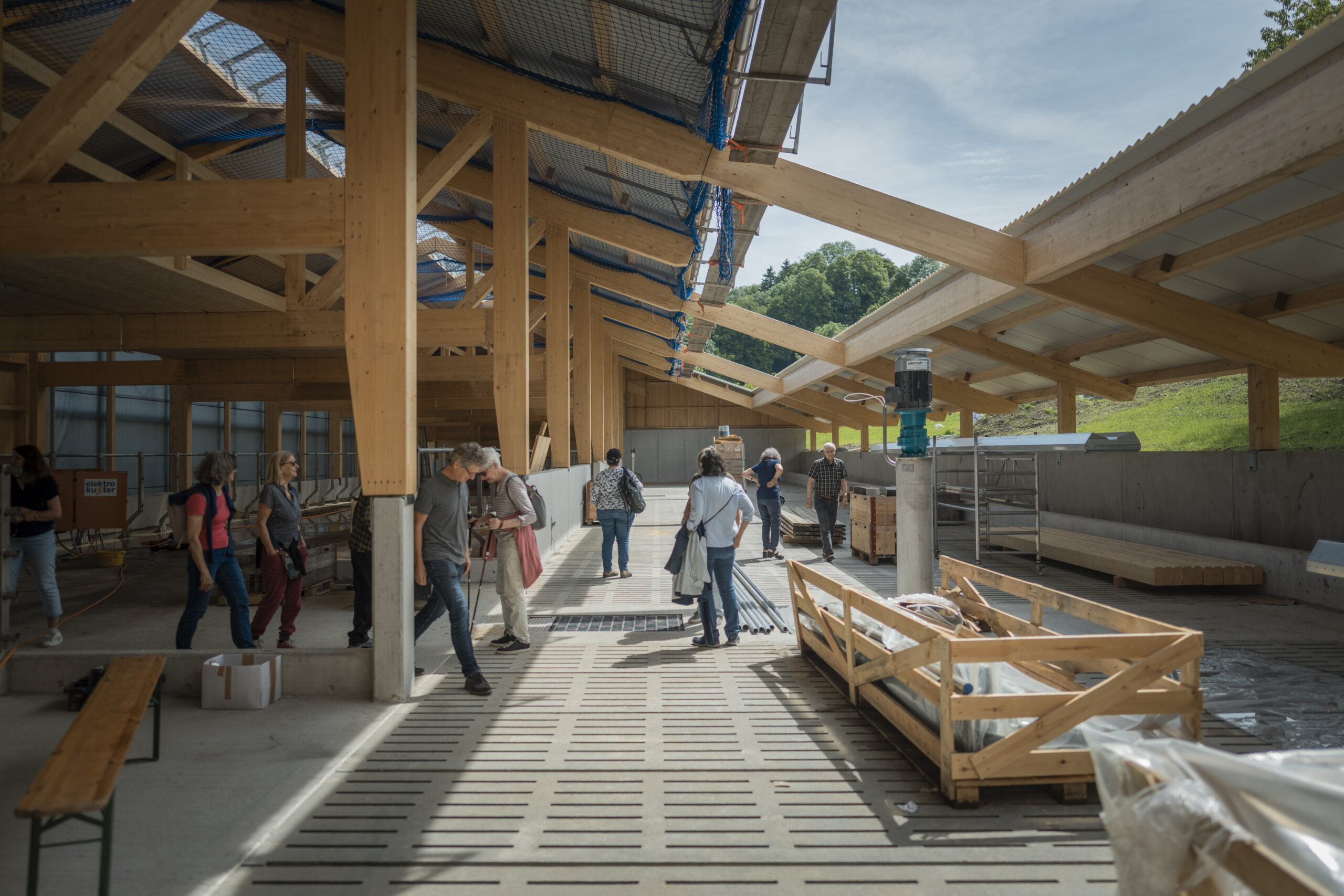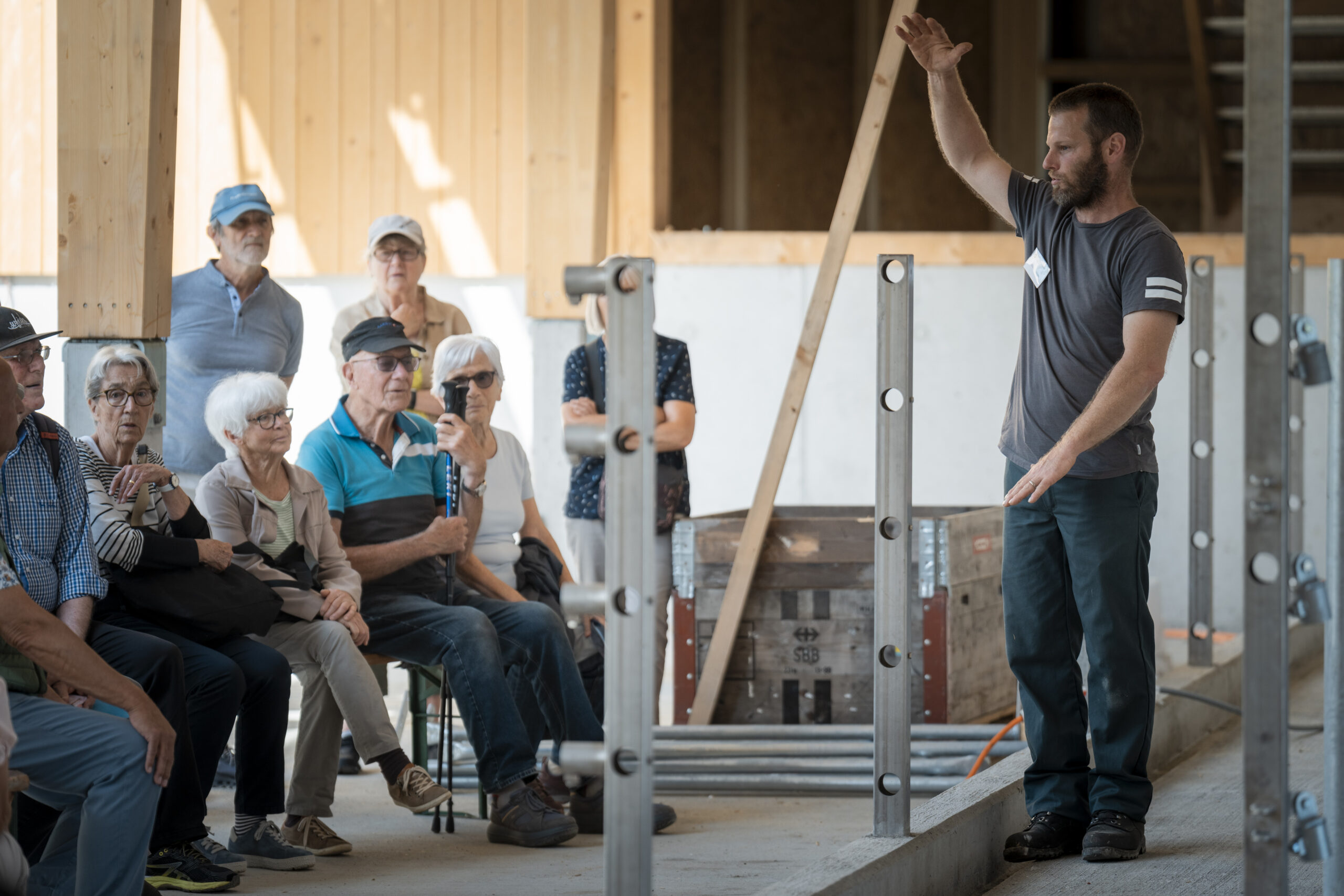 An drei Stationen konnten die Teilnehmerinnen und Teilnehmer Einblicke in den neuen Laufstall und die damit verbundenen Themen Bauen und Architektur, Demeterbetrieb und Stall sowie Landwirtschaft und Biodiversität erhalten.
