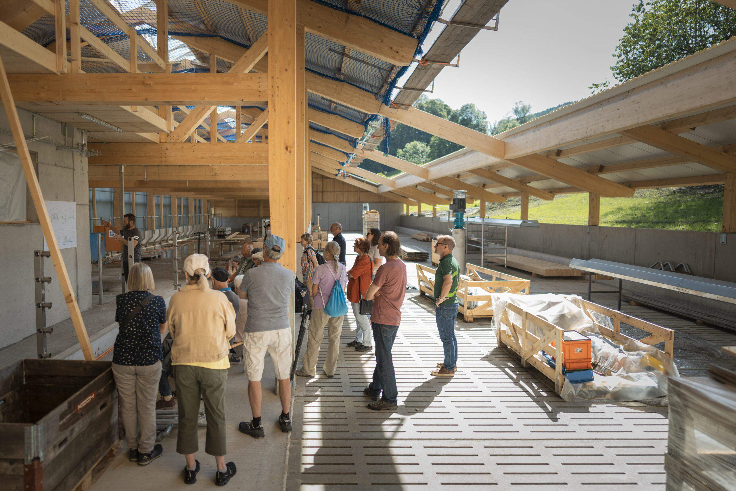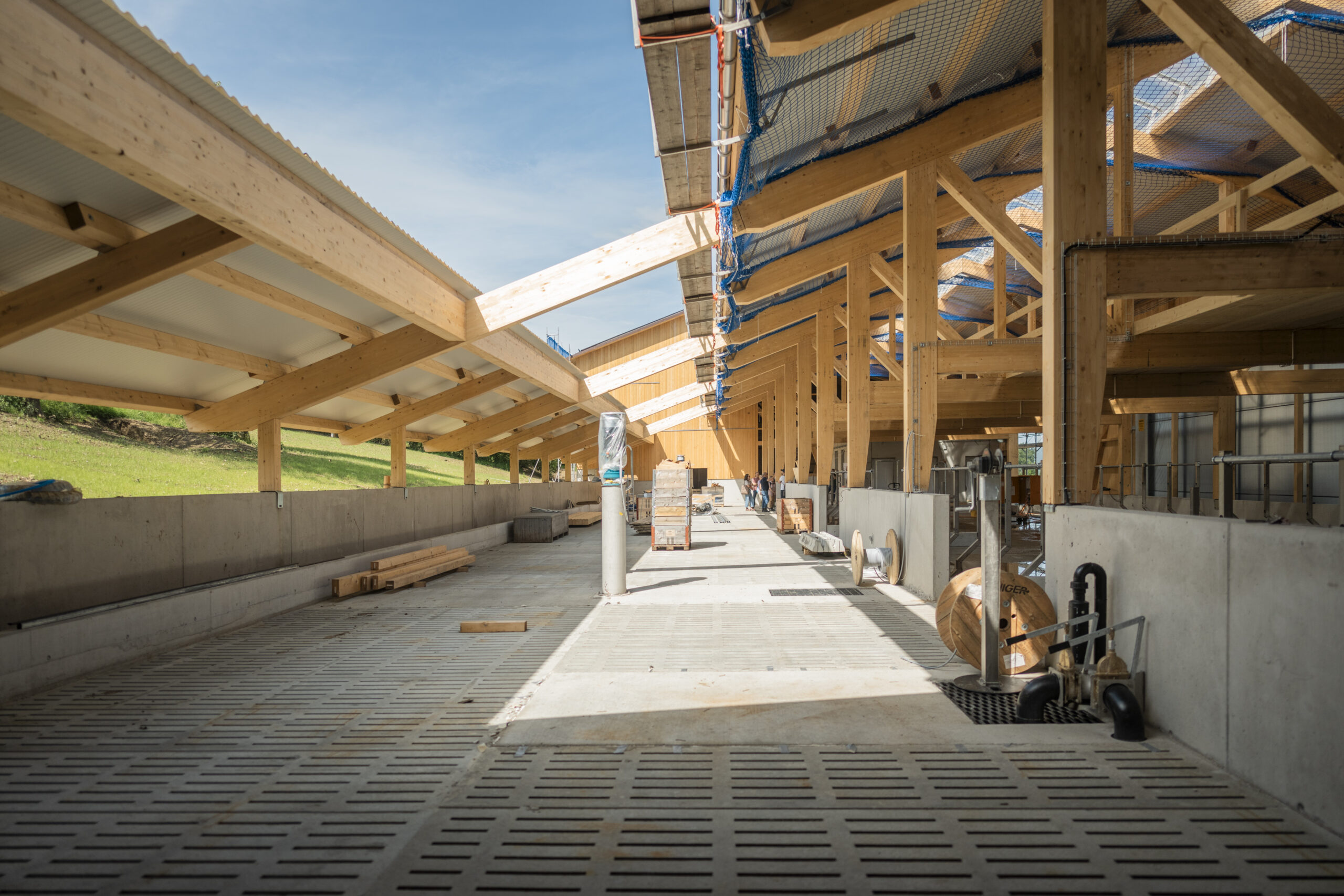 Baubeginn des neuen Rindviehlaufstalls für den stadtnahen Demeter-Landwirtschaftsbetrieb Wiesenweid war im Oktober 2023. Im Juli 2024 sollen 43 Kühe in den offenen und hellen Stall einziehen. Landwirt Markus Gantenbein bekräftigte, dass der neue Laufstall dem Tierwohl diene. Der Stall bietet zudem Platz für einen Heustock und Hochsilos. Dadurch kann künftig auf die weissen Siloballen verzichtet werden. Mit den eingebauten Quellfassungen und dem Rückhalt von Regenwasser vom Dach werden, was nachhaltig ist und Wasserkosten reduziert, erläuterte Matthias Obertäufer, der Leiter Liegenschaftenunterhalt der Ortsbürgergemeinde. Mit dem Einbau von Photovoltaikanlagen auf dem Dach des Rindviehlaufstalls und auf dem Dach des Jungviehstalls beim Restaurant Scheitlinsbüchel, der anschliessend noch umgebaut wird, wird Strom für rund 30 Einfamilienhäuser produziert, der vom Landwirtschaftsbetrieb, dem Wohnhaus der Pächterfamilie und vom Restaurant Scheitlinsbüchel genutzt werden kann. Überschüsse werden ins öffentliche Netz gespiesen. “Besonders freut uns, dass der Stall zu rund 80 % aus Schweizer Holz hergestellt werden konnte. Ein Grossteil davon stammt aus dem Wald bzw. vom Forstbetrieb der Ortsbürgergemeinde St.Gallen. Damit schliesst sich ein Kreis.”, sagt Bürgerratspräsidentin Katrin Meier.