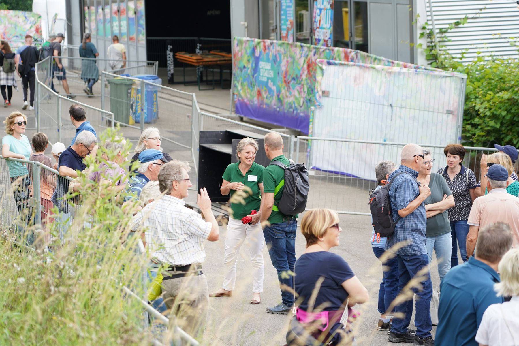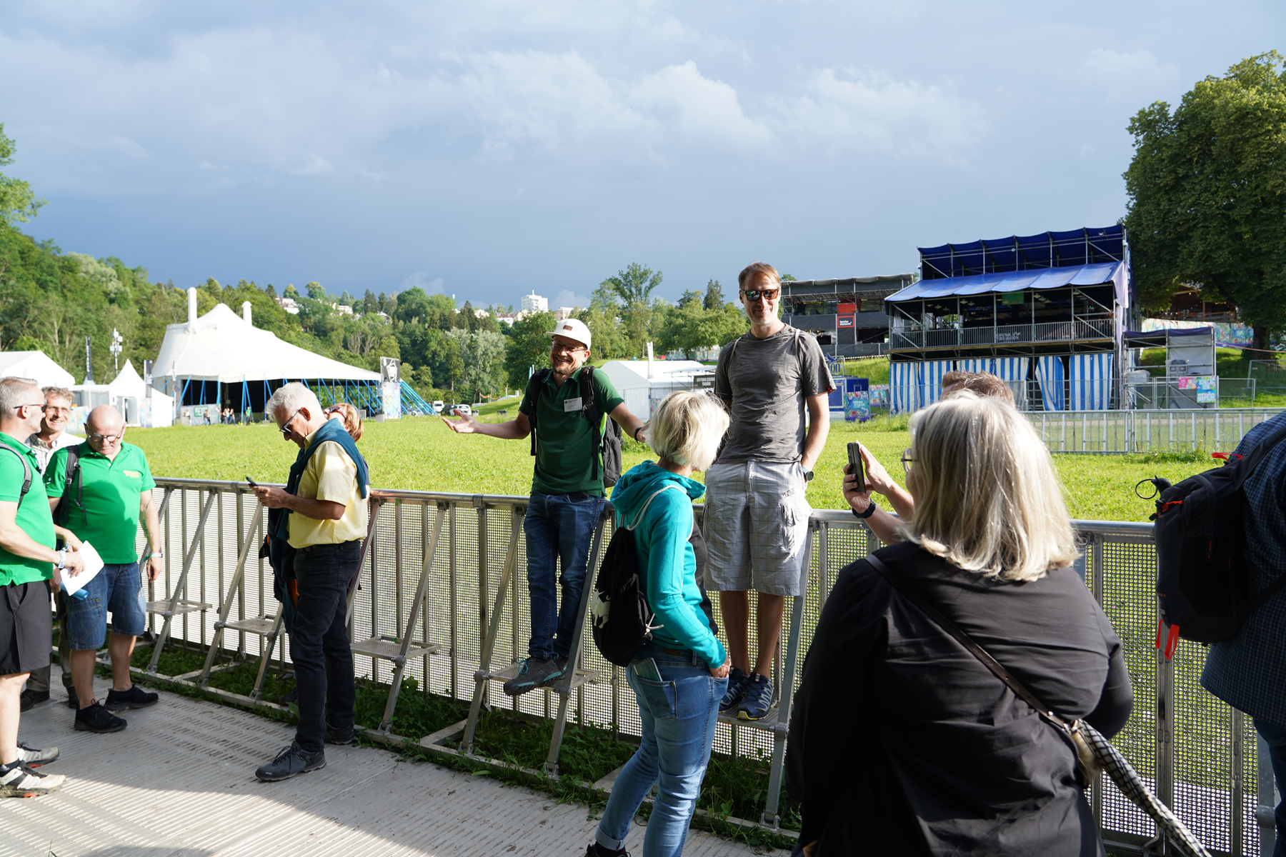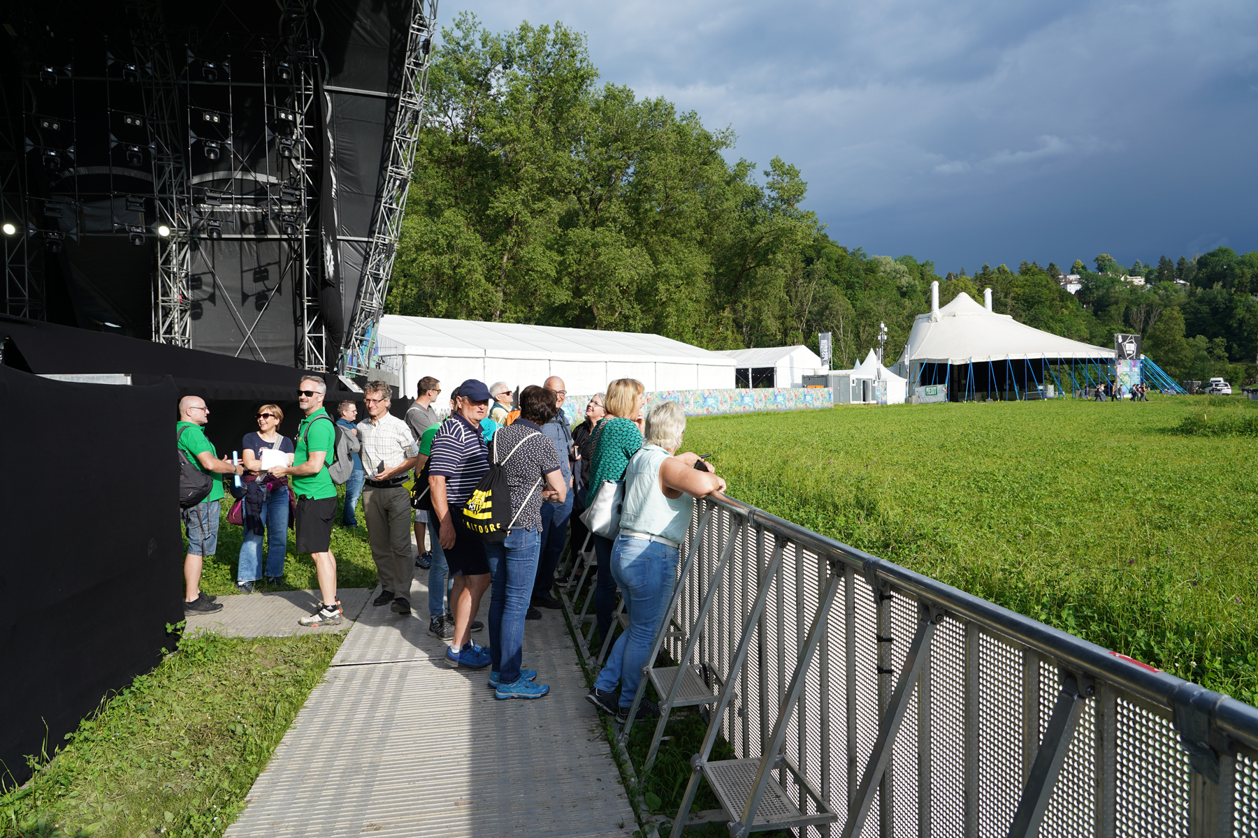 Die Ortsbürgergemeinde unterstützt das Openair St. Gallen, da es mit seiner Einzigartigkeit und kulturellen Relevanz zur Lebensqualität unserer Stadt beiträgt. Als Dankeschön konnten Bürgerinnen und Bürger am Mittwochabend vor dem offiziellen Start des Festivals an einer exklusiven Führung hinter die Kulissen teilnehmen. Während der rund einstündigen Besichtigung erhielten die Teilnehmenden der Ortsbürgergemeinde spannende Einblicke hinter die Bühnen, in verschiedene Restaurants und sogar in den Backstage-Bereich. Im Anschluss an die Führung genossen die Bürgerinnen und Bürger einen feinen Apéro im VIP-Bereich.