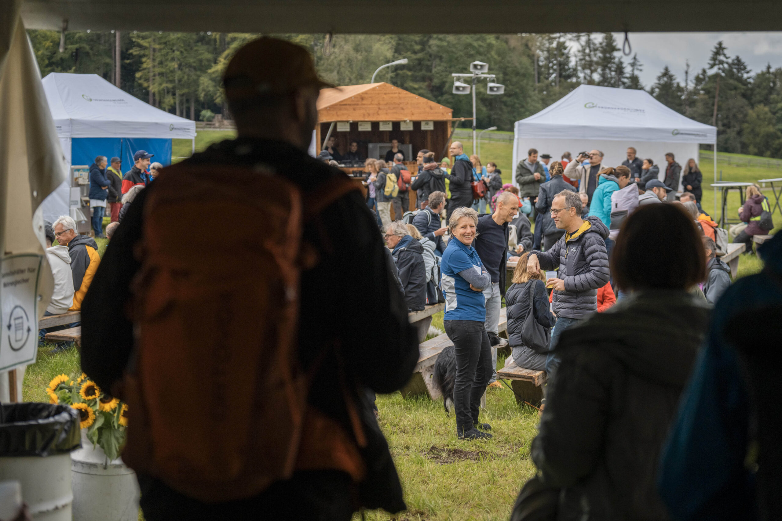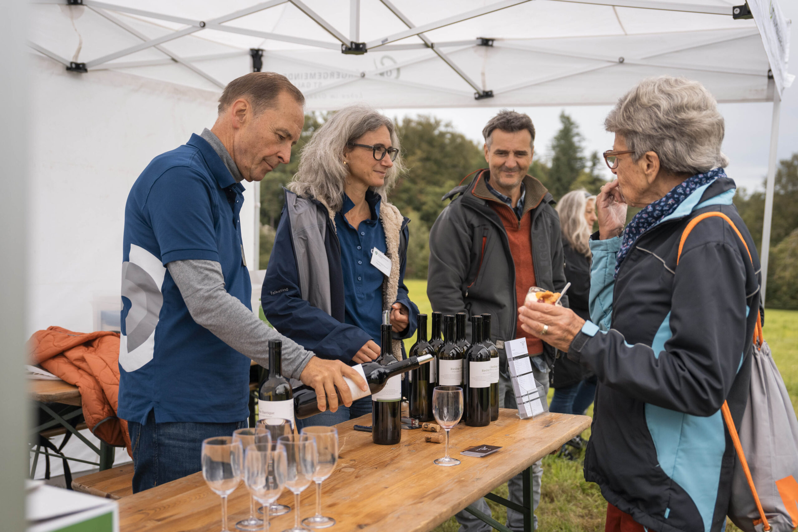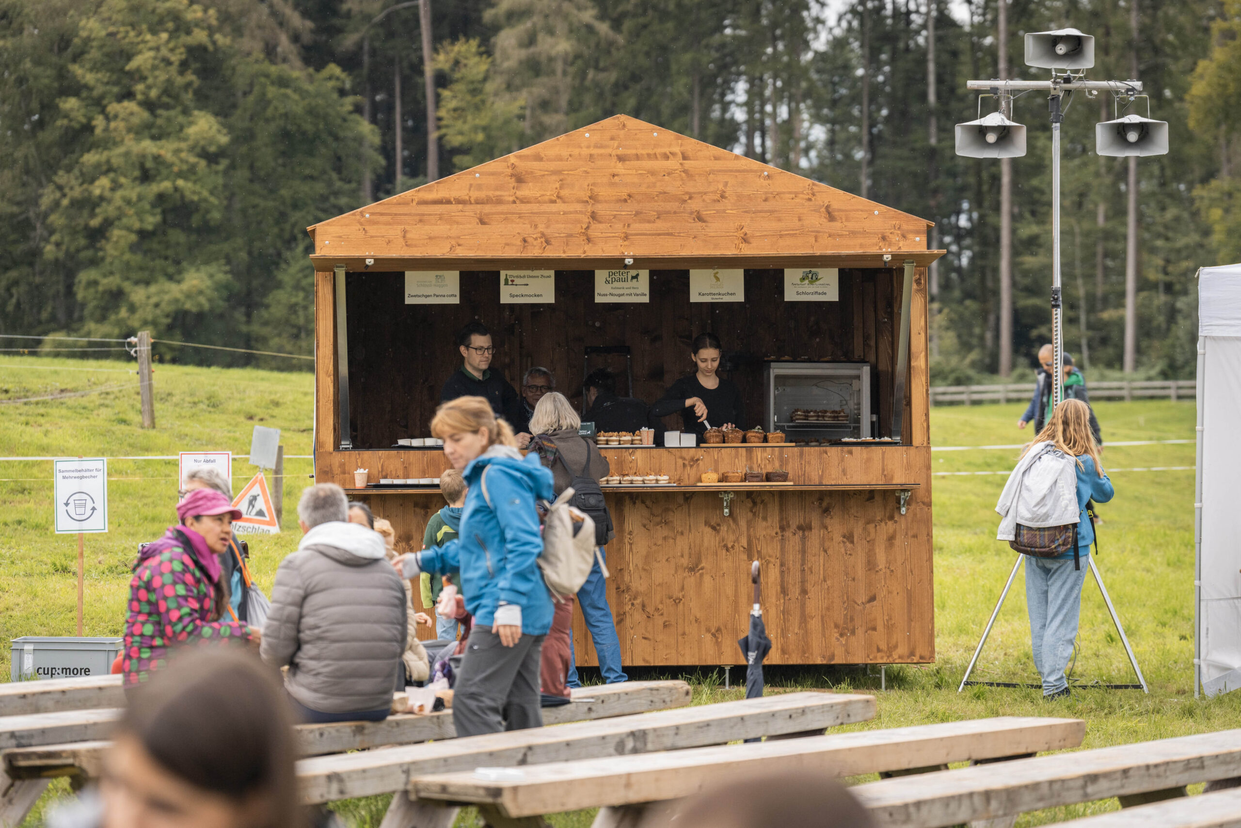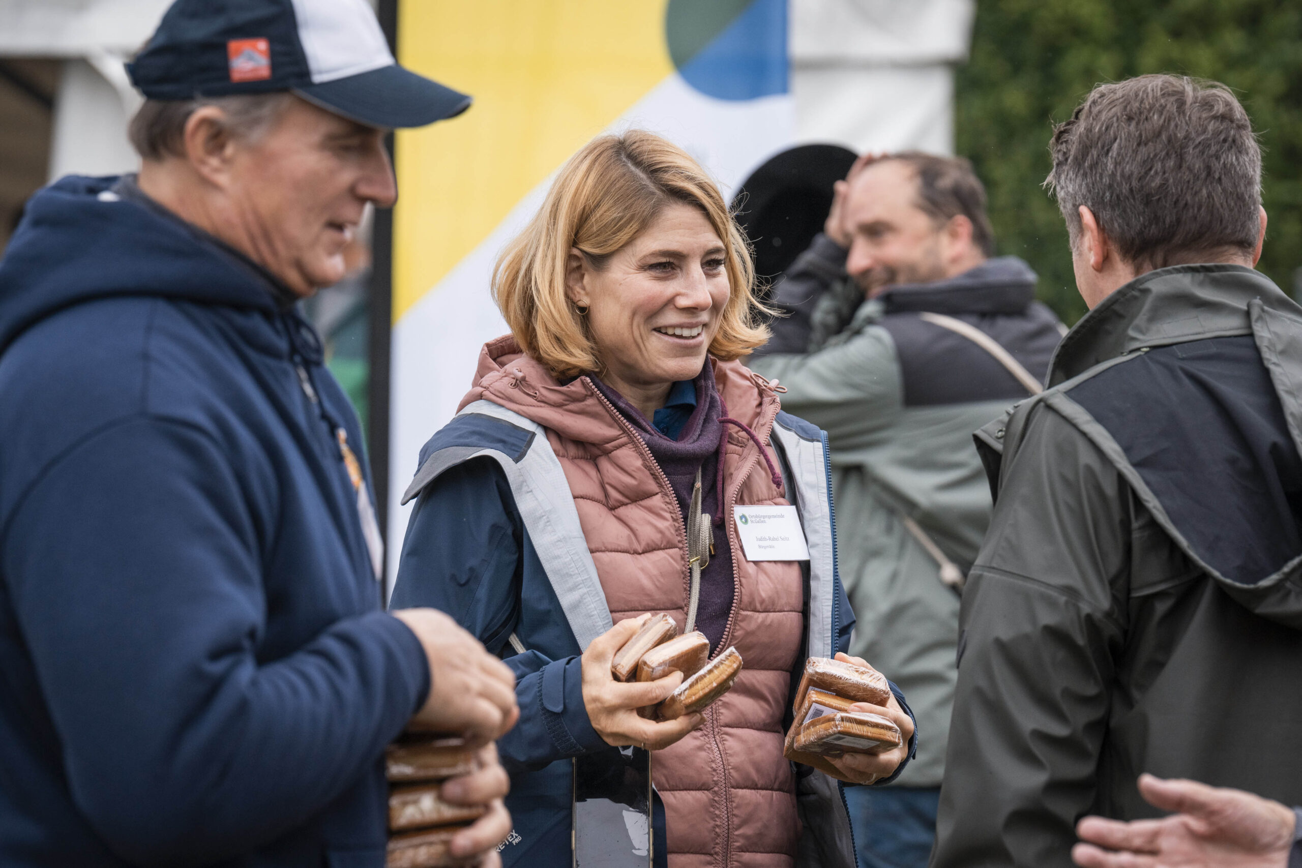 Nach der regnerischen aber sehr schönen Wanderung, vorbei am Zwetschgenhalt, fanden sich die Bürgerinnen und Bürger sowie ihre Verwandten und Freunde auf dem Festplatz ein. Unter der Leitung des ortsbürgerlichen Forstbetriebsleiters Patrik Hollenstein hatten die Mitarbeitenden der Ortsbürgergemeinde trotz der schwierigen Wetterbedingungen eine ausgezeichnete Festinfrastruktur aufgebaut. Alle Gäste fanden einen trockenen Platz, um die Bürgerwanderung bei Speis und Trank gemütlich zu feiern und ausklingen zu lassen. Vielfältige kulinarische Genüsse wurden geboten: Neben den St.Galler Bratwürsten gab es feines Raclette. Besonders hervorzuheben ist das umfangreiche Dessertbuffet, das von den ortsbürgerlichen Restaurantpächterinnen und -pächtern gemeinsam angeboten wurde: Zur Auswahl standen unter anderem Schlorzifladen vom Restaurant Scheitlinsbüchel, Speckmocken vom Unteren Brand, Nuss-Nougat vom Restaurant Peter & Paul, Zwetschgen-Panna cotta vom Schlössli Haggen und Karottenkuchen aus dem Formidable Pelikan.