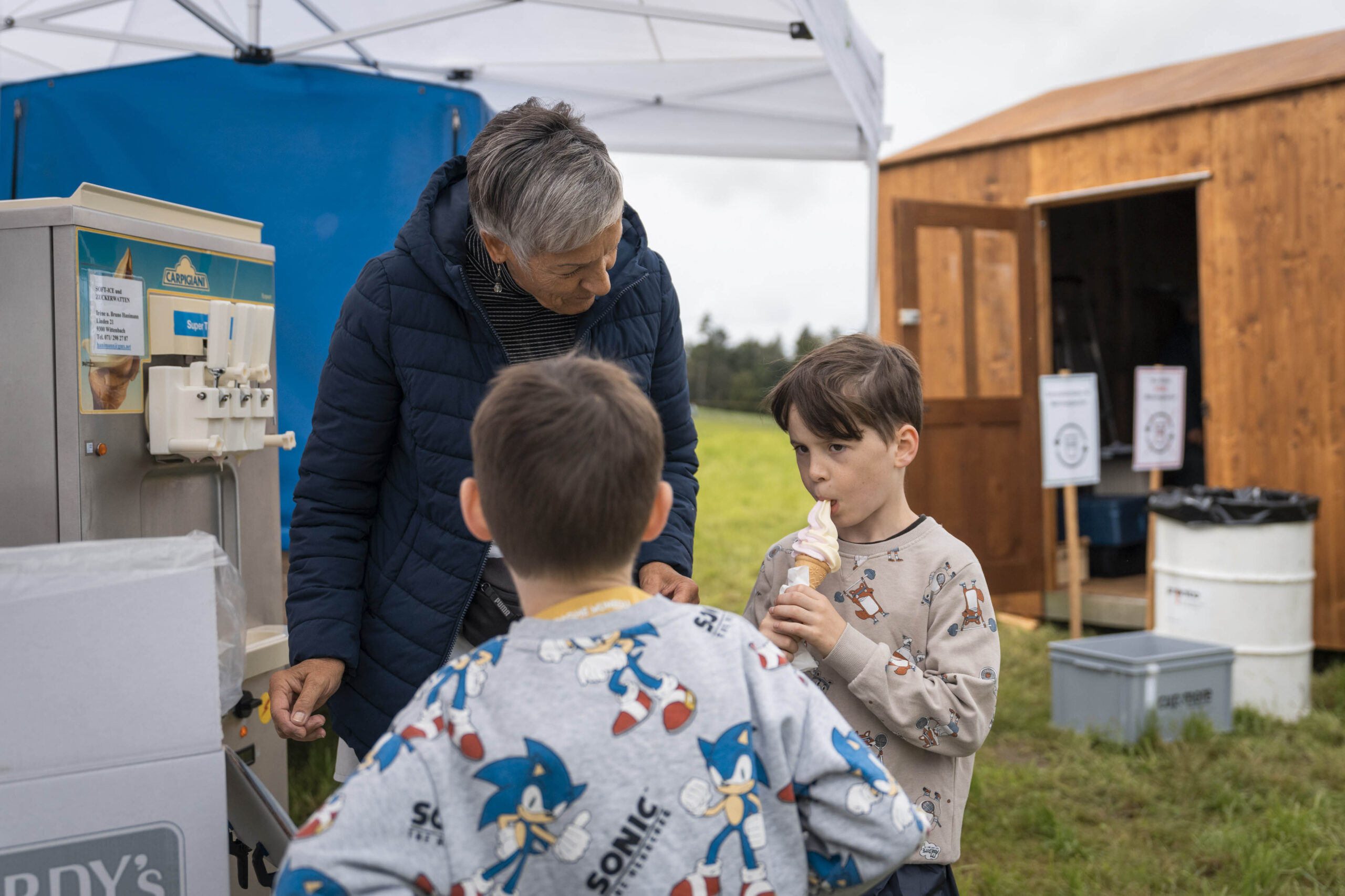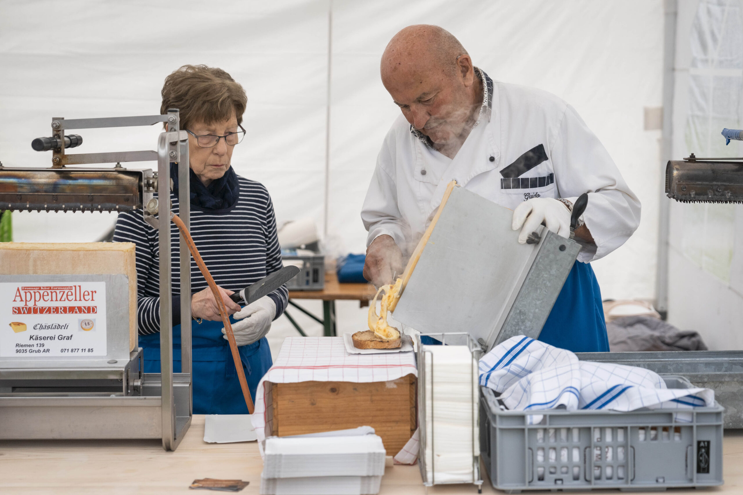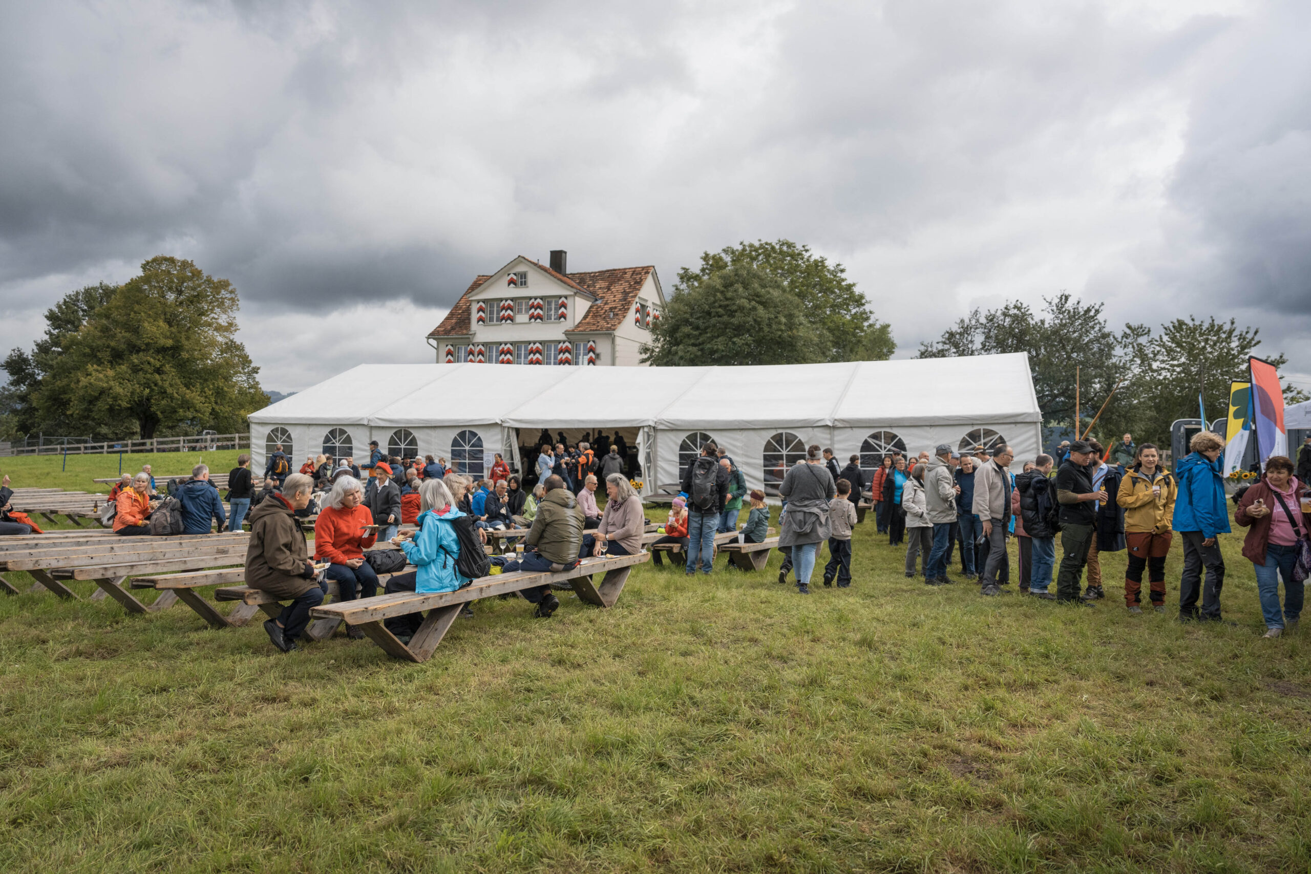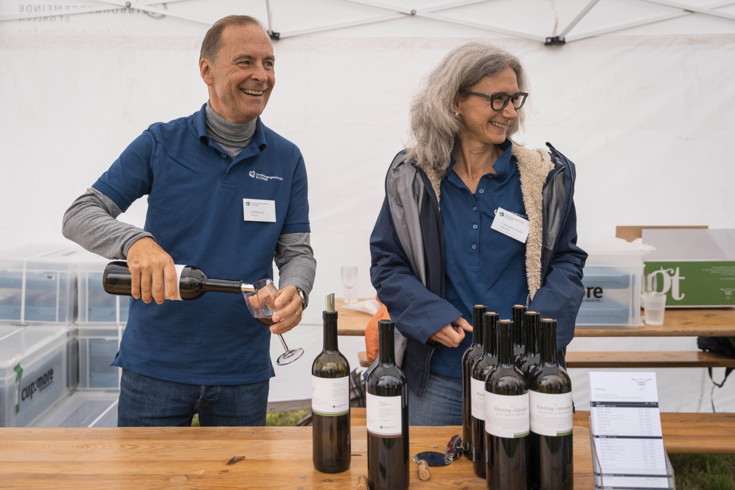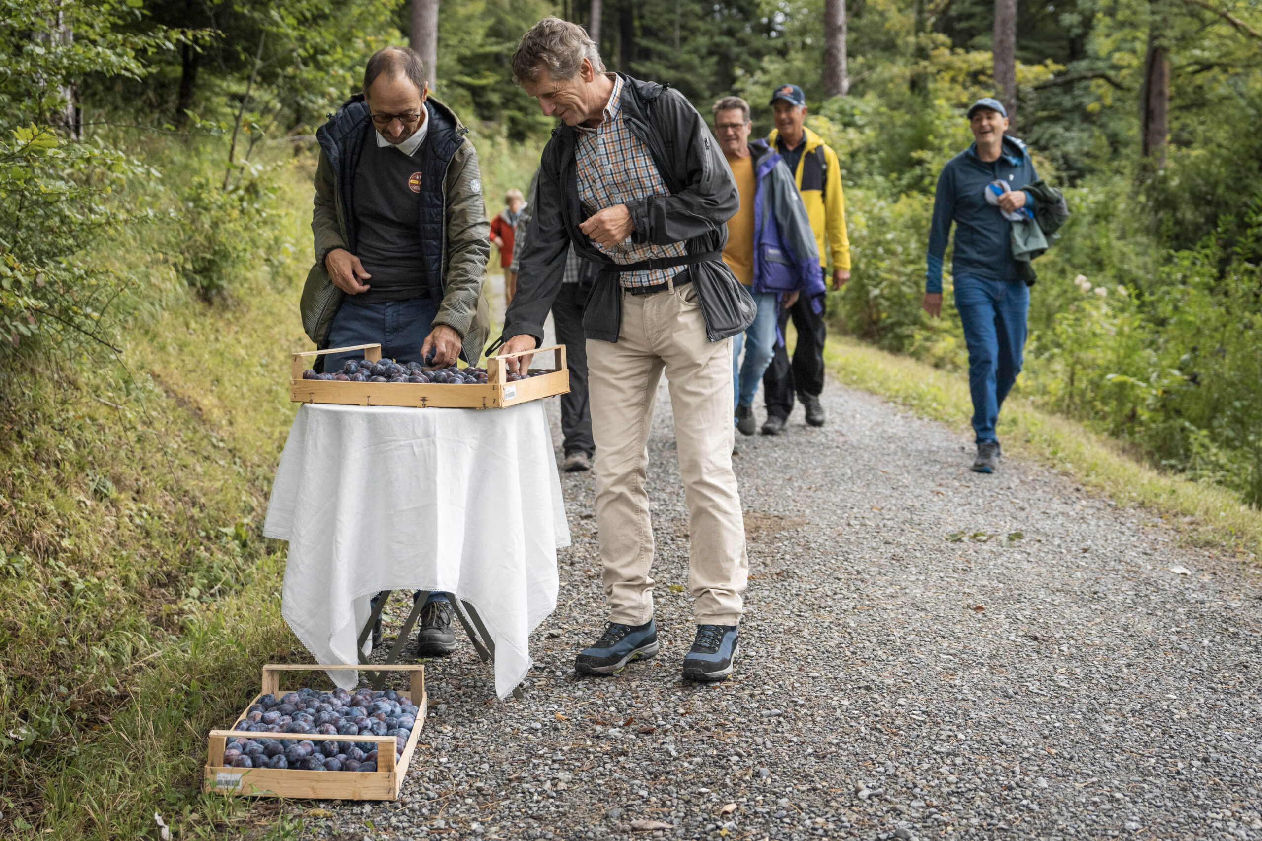 Nach der regnerischen aber sehr schönen Wanderung, vorbei am Zwetschgenhalt, fanden sich die Bürgerinnen und Bürger sowie ihre Verwandten und Freunde auf dem Festplatz ein. Unter der Leitung des ortsbürgerlichen Forstbetriebsleiters Patrik Hollenstein hatten die Mitarbeitenden der Ortsbürgergemeinde trotz der schwierigen Wetterbedingungen eine ausgezeichnete Festinfrastruktur aufgebaut. Alle Gäste fanden einen trockenen Platz, um die Bürgerwanderung bei Speis und Trank gemütlich zu feiern und ausklingen zu lassen. Vielfältige kulinarische Genüsse wurden geboten: Neben den St.Galler Bratwürsten gab es feines Raclette. Besonders hervorzuheben ist das umfangreiche Dessertbuffet, das von den ortsbürgerlichen Restaurantpächterinnen und -pächtern gemeinsam angeboten wurde: Zur Auswahl standen unter anderem Schlorzifladen vom Restaurant Scheitlinsbüchel, Speckmocken vom Unteren Brand, Nuss-Nougat vom Restaurant Peter & Paul, Zwetschgen-Panna cotta vom Schlössli Haggen und Karottenkuchen aus dem Formidable Pelikan.
