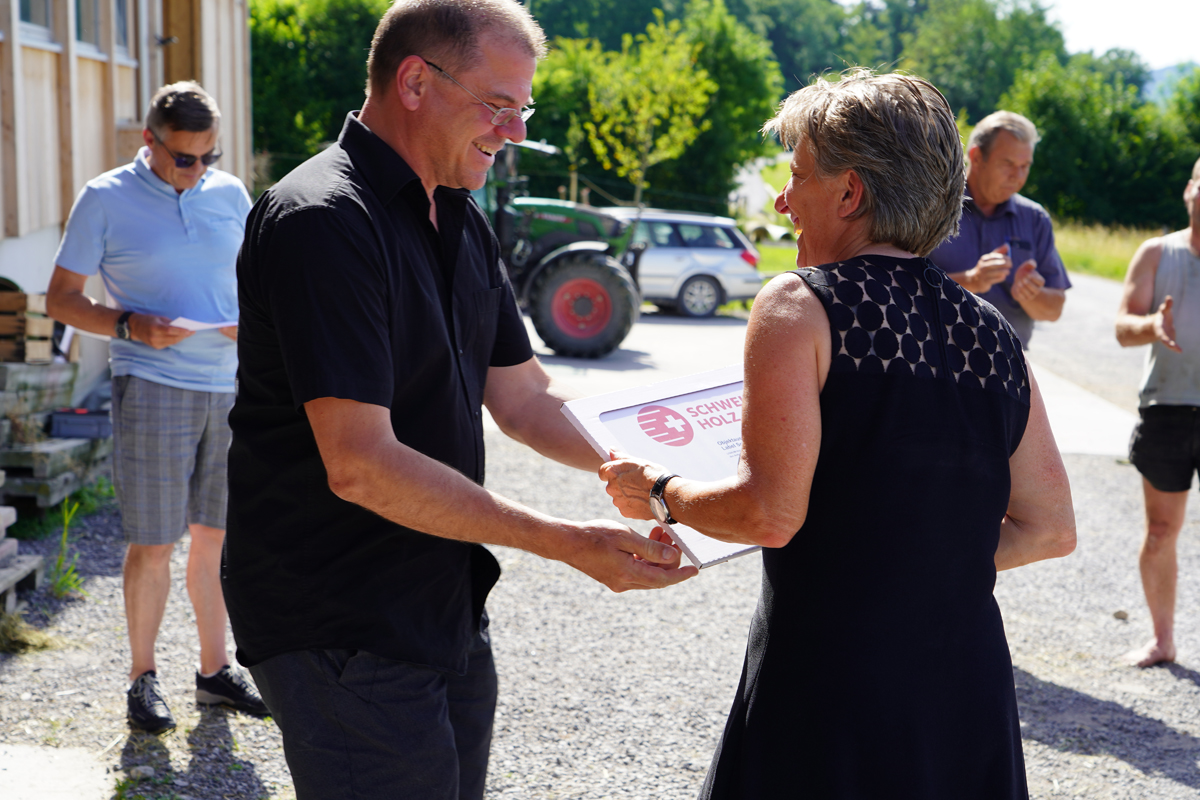 Das Label «Schweizer Holz» garantiert eine durchgängige Verarbeitungskette vom Wald bis zum fertigen Gebäude. «Wer mit Schweizer Holz baut, setzt auf einen nachhaltigen, nachwachsenden Rohstoff mit kurzen Transportwegen – und entlastet gleichzeitig unsere Umwelt spür-bar», betont Heinz Engler von der Lignum Holzkette St.Gallen in seiner Laudatio zur Preisver-leihung.