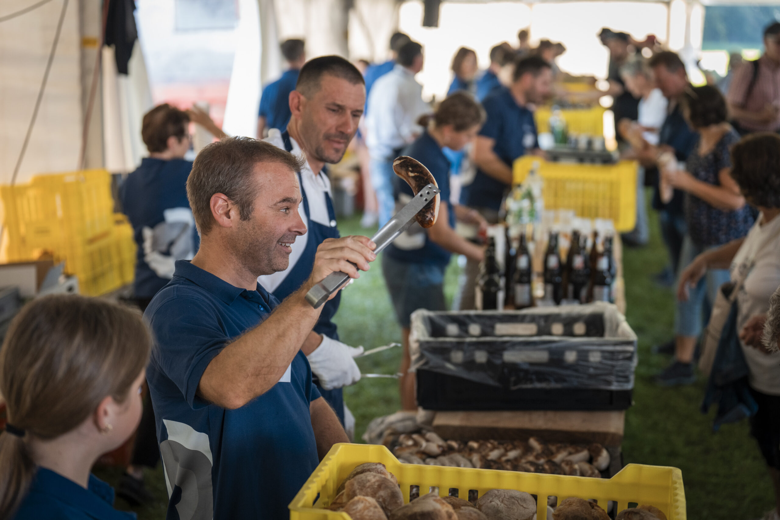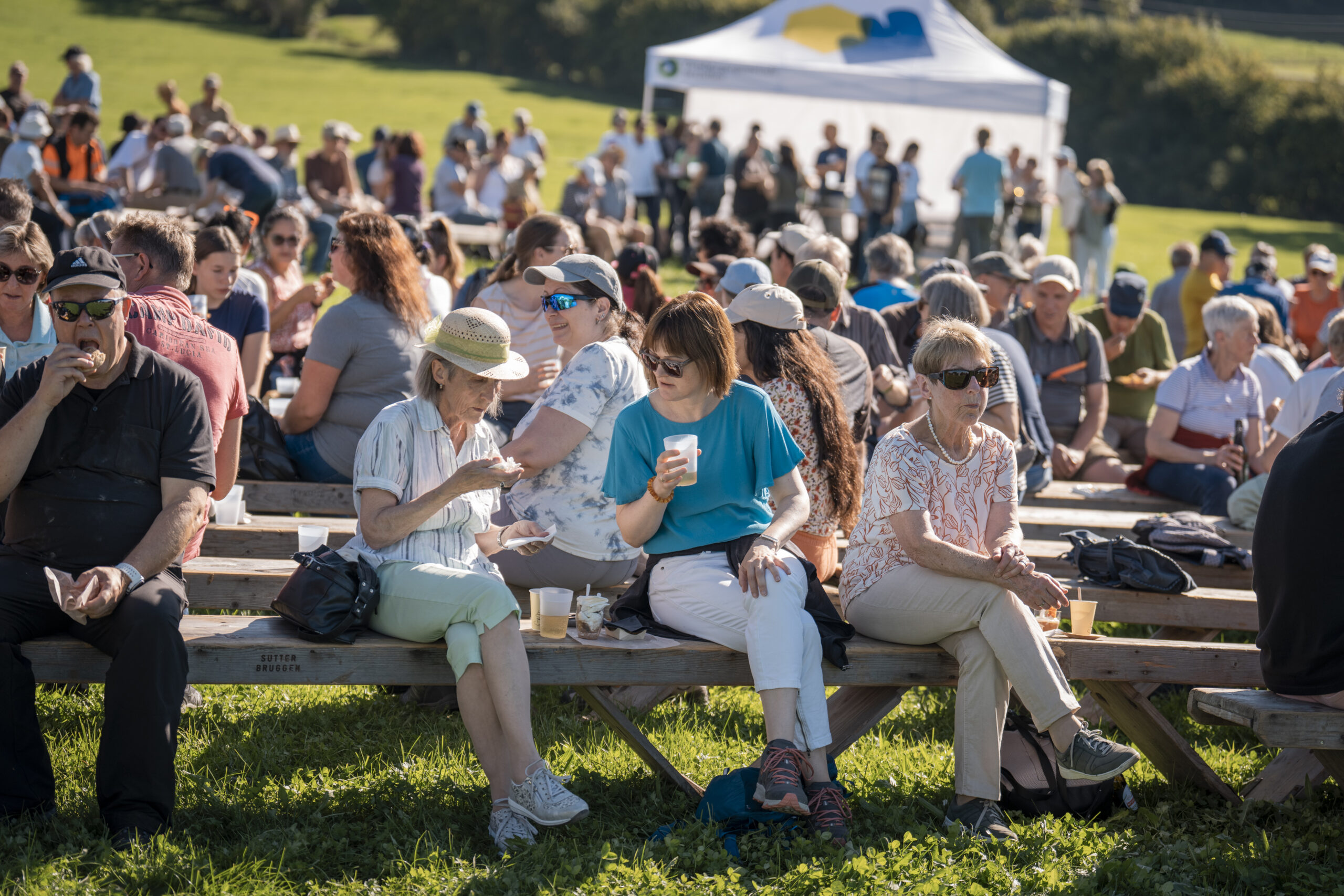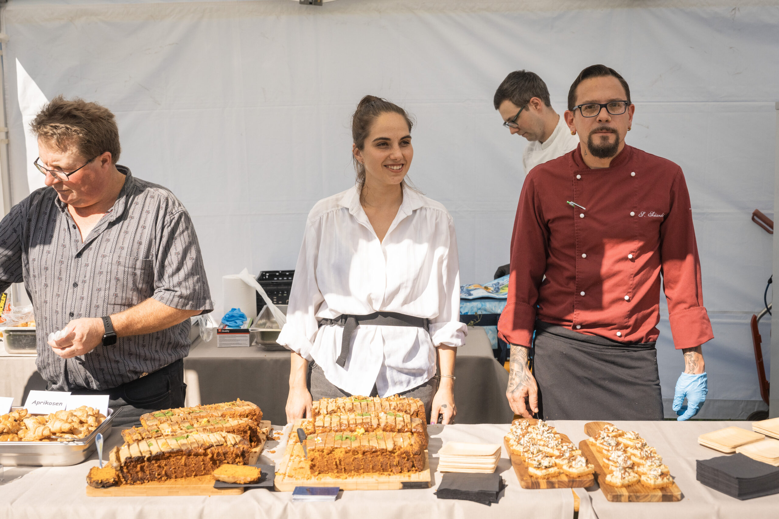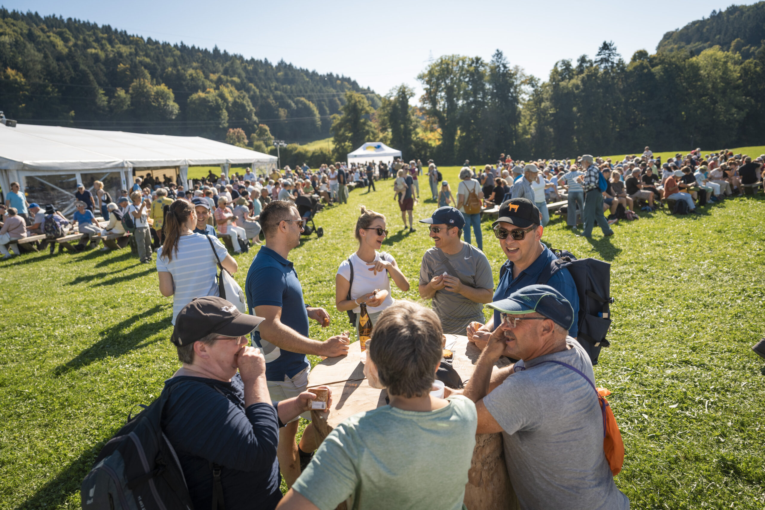 Am Ziel beim Landwirtschaftsbetrieb Herbrig erwarteten die Gäste eine festliche Infrastruktur, die unter der Leitung des ortsbürgerlichen Revierförsters Patrik Hollenstein und von den Mitarbeitenden der Ortsbürgergemeinde aufgebaut worden war. Dort konnten die Wandernden Würste, Raclette und Getränke geniessen. Besonders beliebt war erneut das umfangreiche Dessert-buffet, das von den ortsbürgerlichen Restaurantpächterinnen und -pächtern liebevoll zusammengestellt wurde: Angeboten wurden Schlorzifladen aus dem Restaurant Scheitlinsbüchel, eine feine Nuss-Nougat-Vanille-Kreation aus dem Restaurant Peter und Paul, Zwetschgen-Panna-Cotta aus dem Schlössli Haggen, Gipfeli mit verschiedenen Füllungen vom Unteren Brand, Rüeblikuchen aus dem Formidable Pelikan sowie ein herbstlicher Kürbis-Cheesecake aus der Falkenburg.