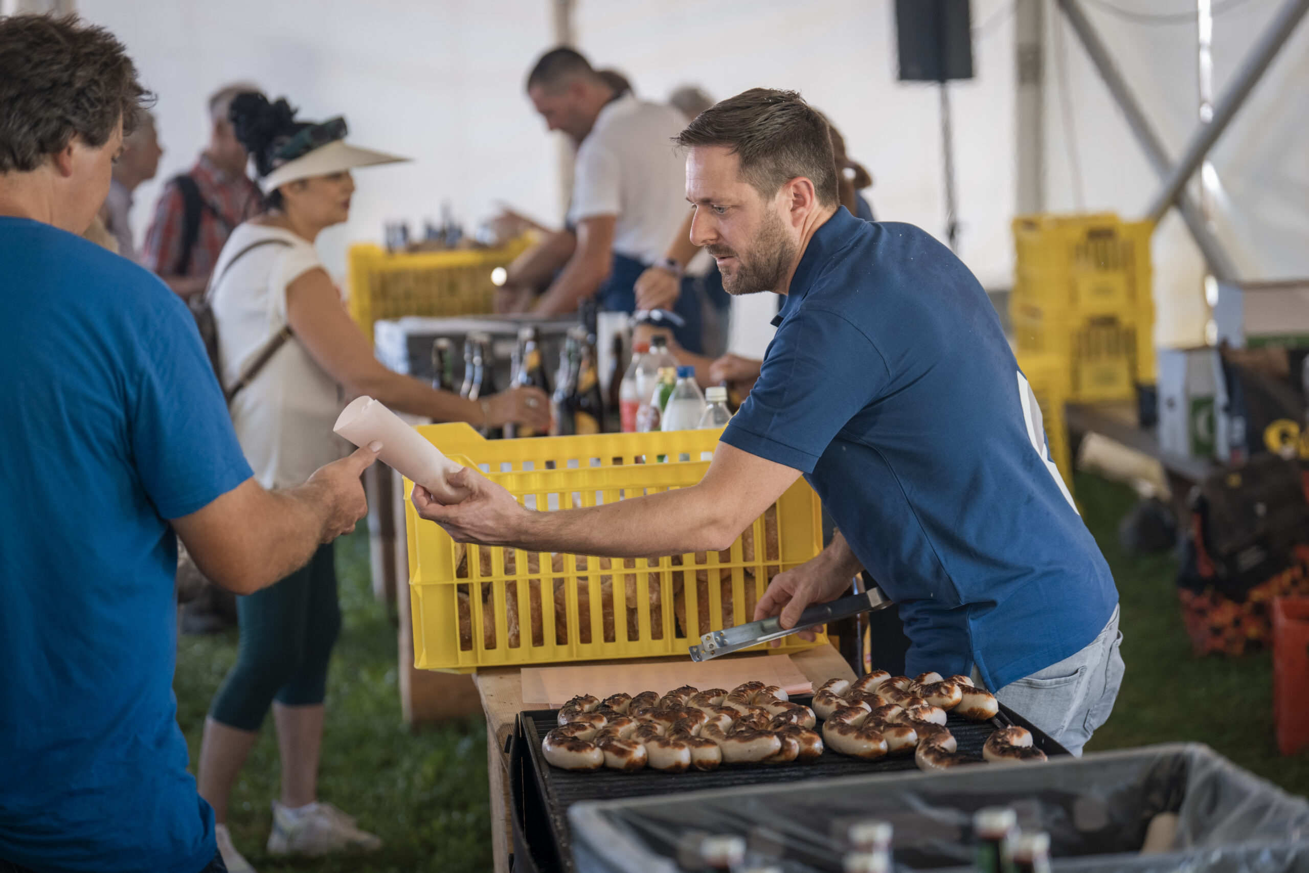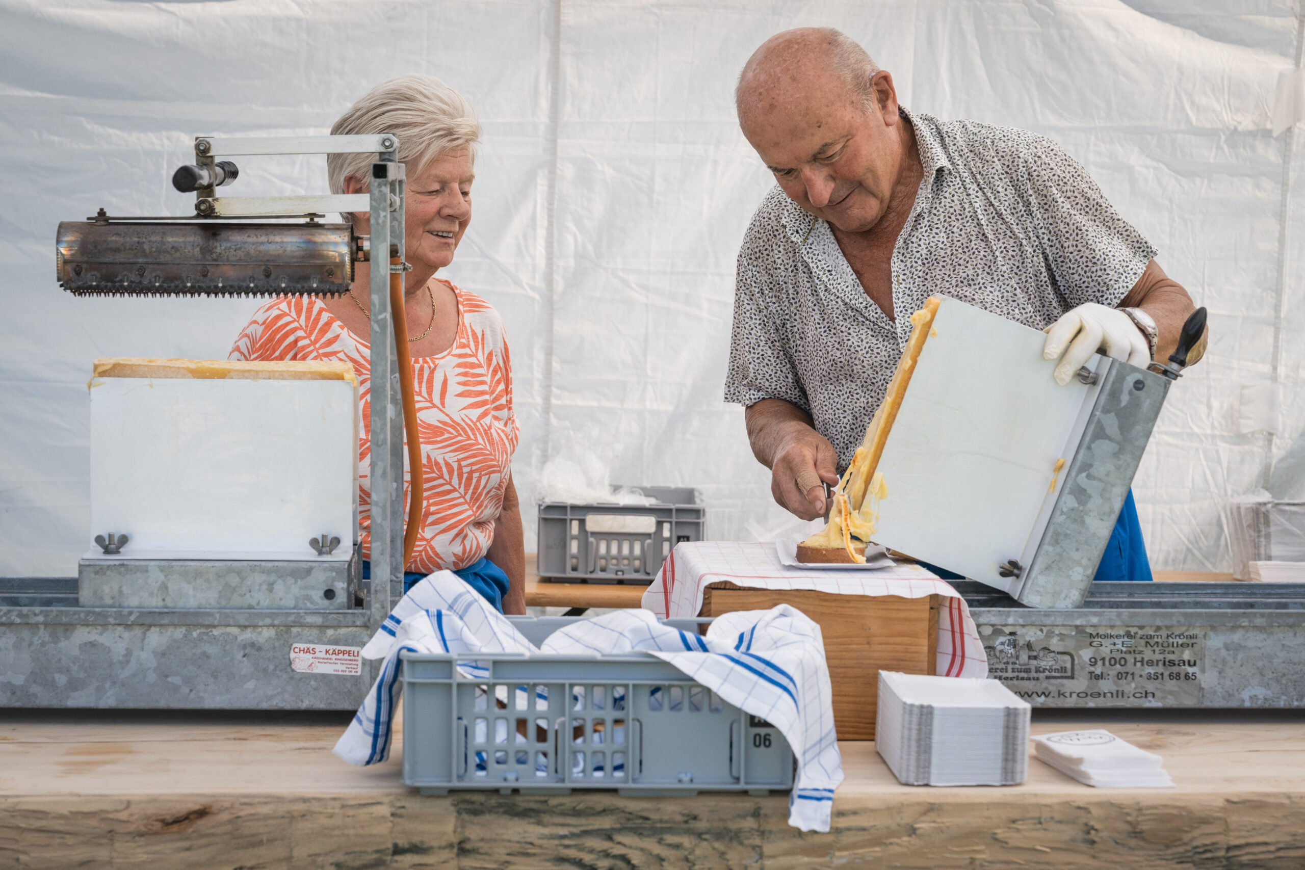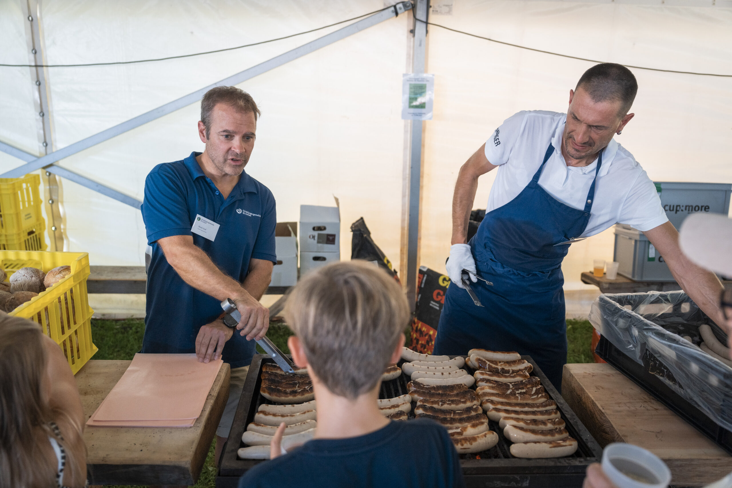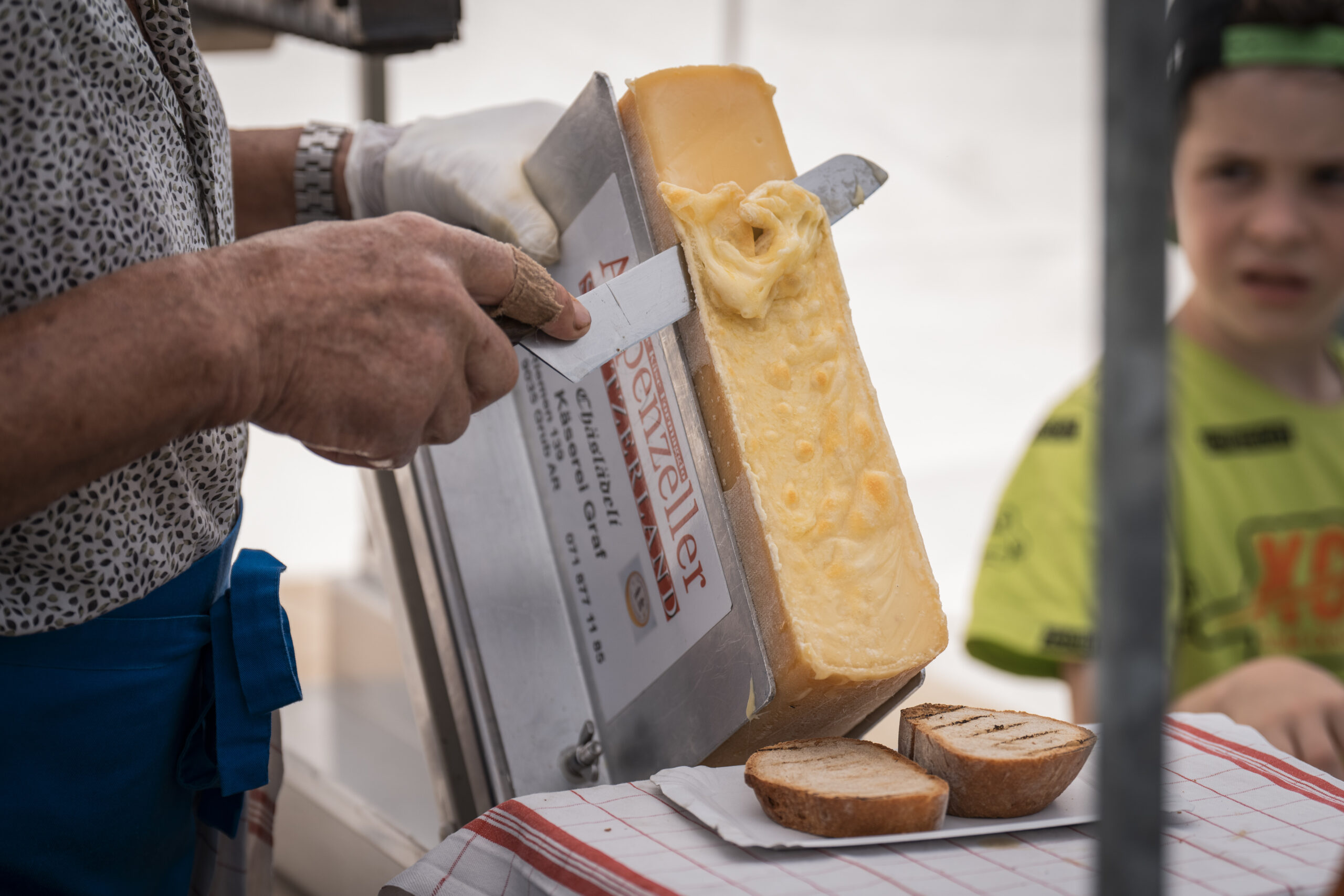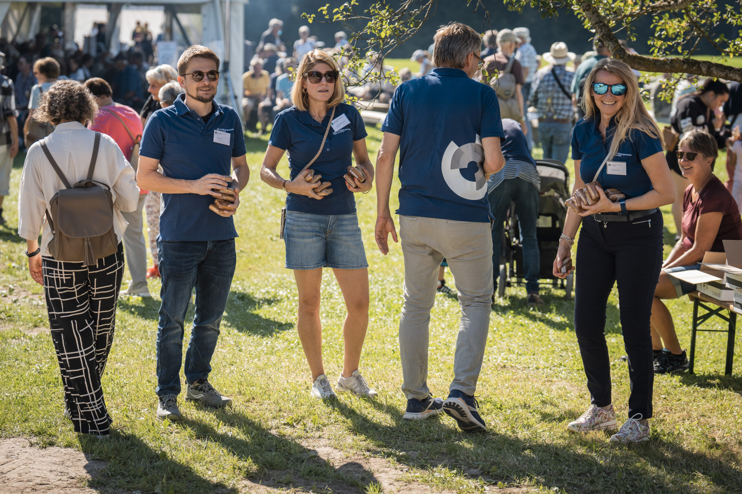 Am Ziel beim Landwirtschaftsbetrieb Herbrig erwarteten die Gäste eine festliche Infrastruktur, die unter der Leitung des ortsbürgerlichen Revierförsters Patrik Hollenstein und von den Mitarbeitenden der Ortsbürgergemeinde aufgebaut worden war. Dort konnten die Wandernden Würste, Raclette und Getränke geniessen. Besonders beliebt war erneut das umfangreiche Dessert-buffet, das von den ortsbürgerlichen Restaurantpächterinnen und -pächtern liebevoll zusammengestellt wurde: Angeboten wurden Schlorzifladen aus dem Restaurant Scheitlinsbüchel, eine feine Nuss-Nougat-Vanille-Kreation aus dem Restaurant Peter und Paul, Zwetschgen-Panna-Cotta aus dem Schlössli Haggen, Gipfeli mit verschiedenen Füllungen vom Unteren Brand, Rüeblikuchen aus dem Formidable Pelikan sowie ein herbstlicher Kürbis-Cheesecake aus der Falkenburg.